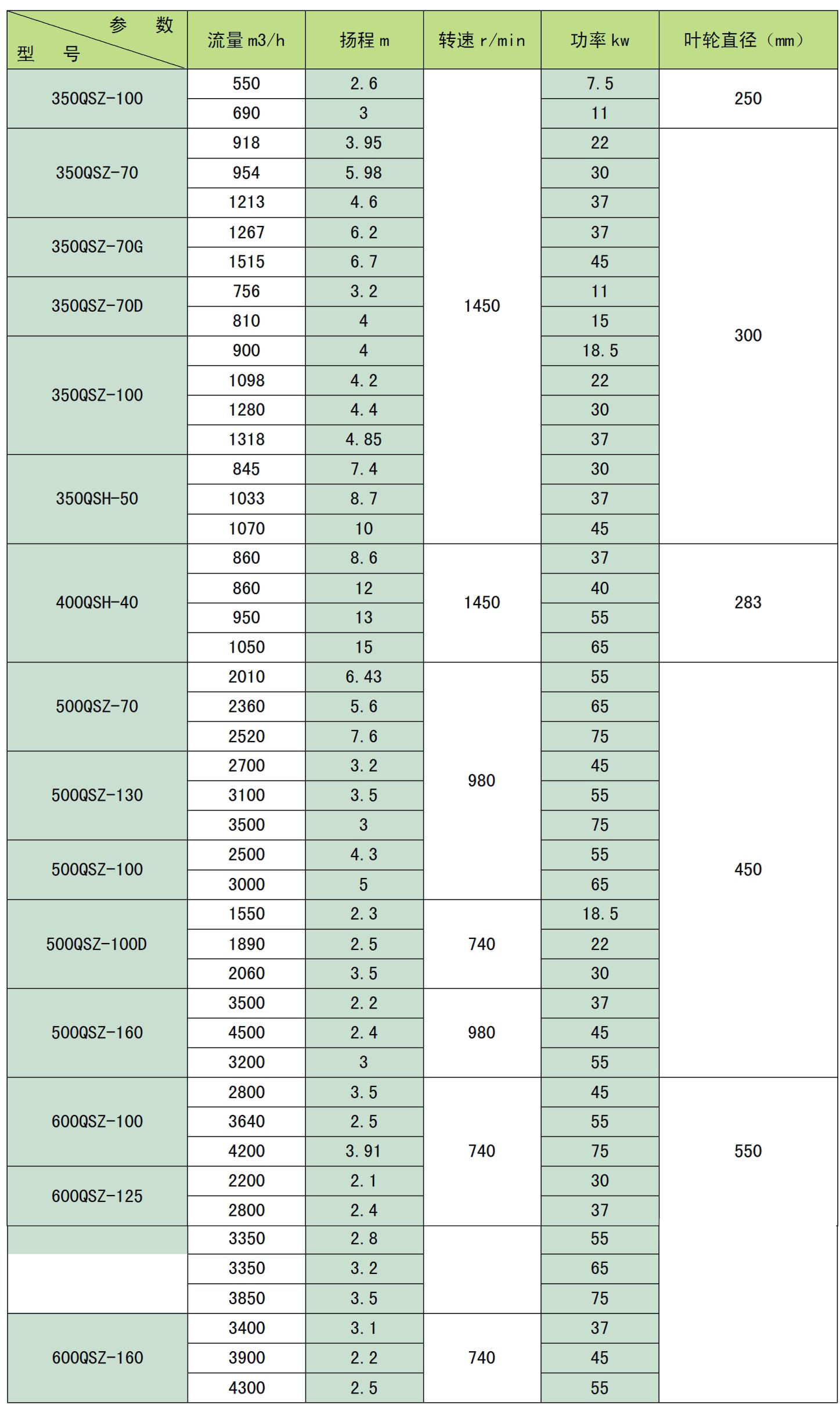 本公司潛水泵名義出水口徑從350、500、600、700、800、900、1000、1200、1400、1600共計十種口徑,流量范圍0.12-12m3/s,揚程范圍2-14m;功率范圍7.5-630kW;電壓等級380V、660V、3kV、6kV 、10kV。